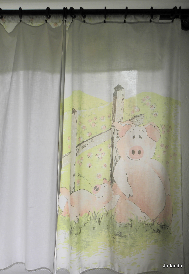 I jeszcze słówko o zasłonach. Kocham te prosiaczki na lambrekinie, poprawiają mi humor. Uszyłam je jakiś czas temu z dziecinnej pościeli, oczywiście ze szmatexu. Sztukowałam, wykorzystałam każdy kawałeczek, najpierw były zazdroski, lambrekin z poszewki na poduszkę i jedna zasłona, dlatego z resztek uszyłam zwis w postaci kokardy. Później dokupiłam białą pościel i doszyłam dwie zasłony.